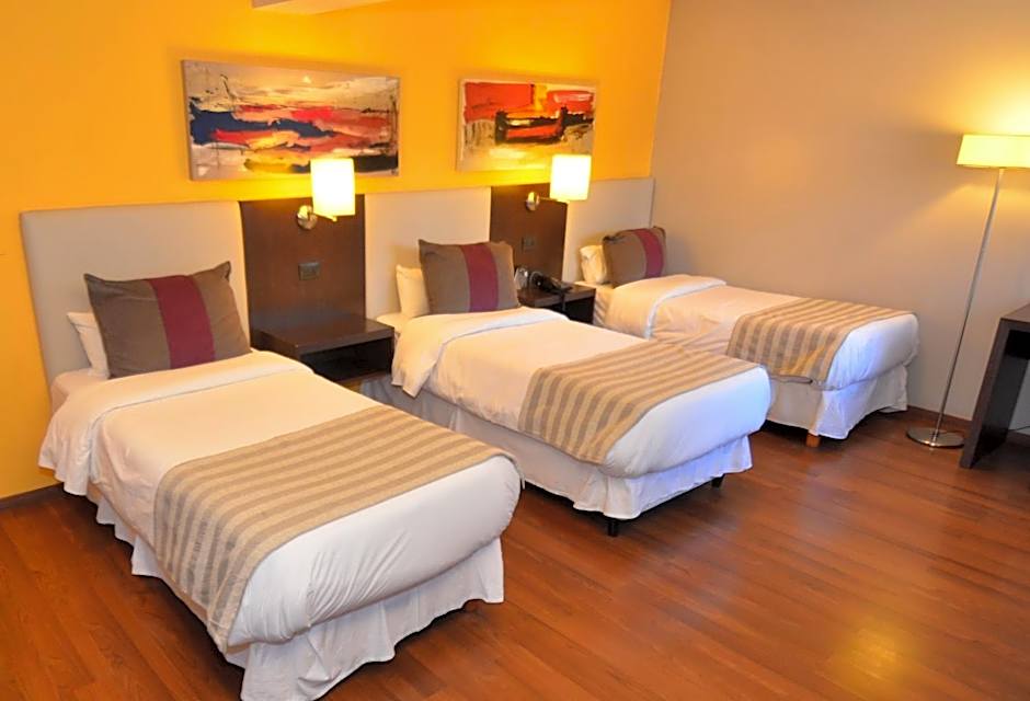 With tiled floors and anti-allergic pillows, this comfortable and air-conditioned room is fitted with a double bed and a larger single bed. It features a flat-screen TV with internet, wardrobe, desk and mini-bar. The private bathroom has a hot shower and a toilet hose sprayer.